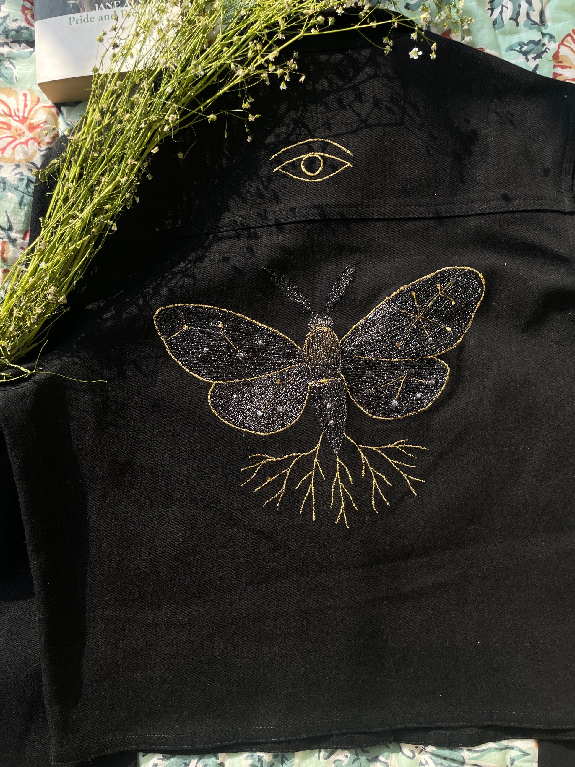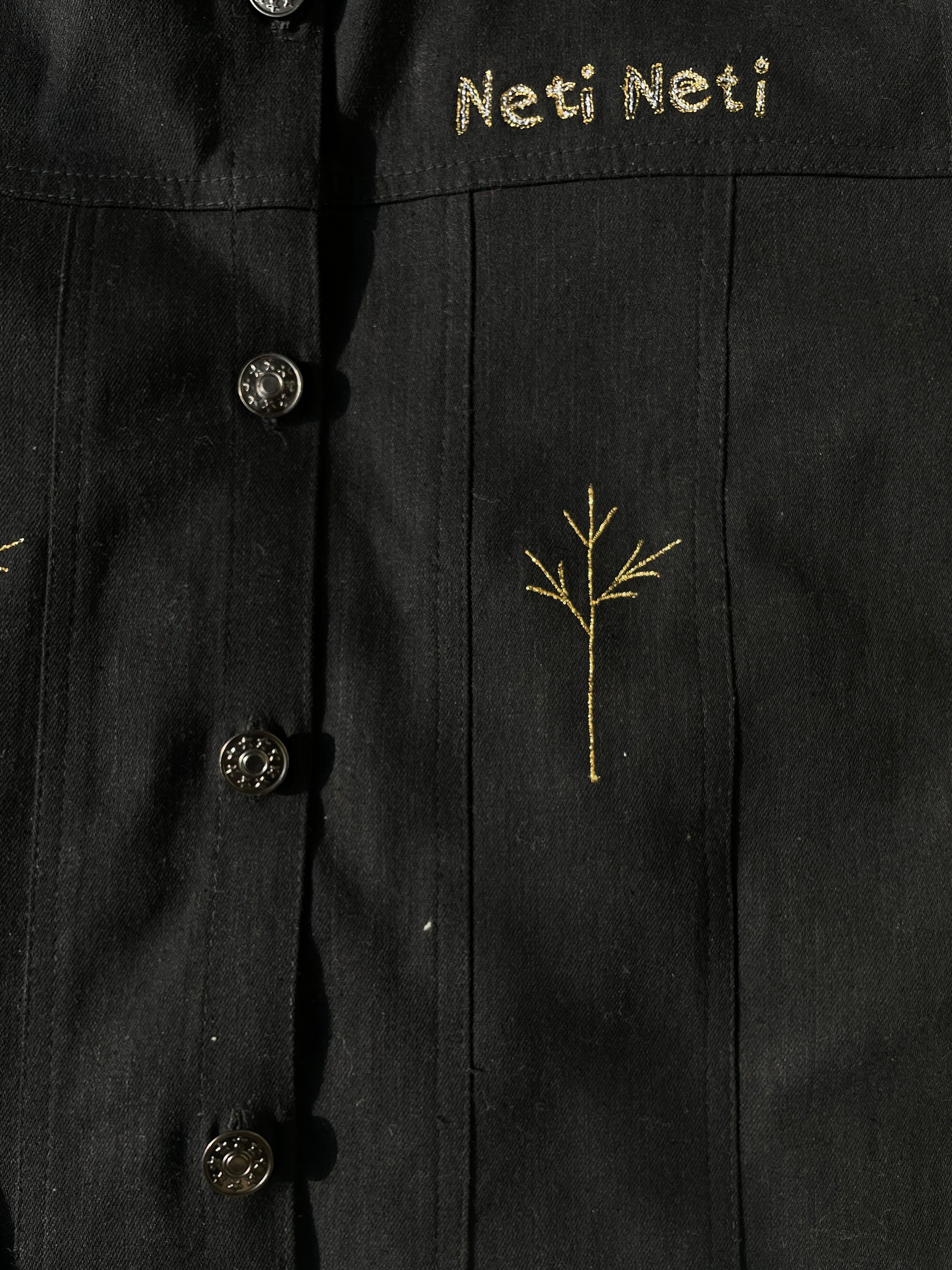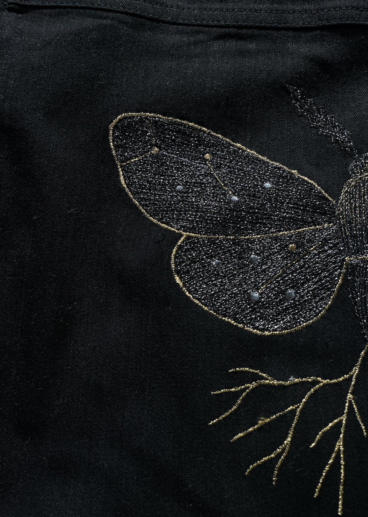 Heavy black denim with hand-guided embroidered metallic detailing