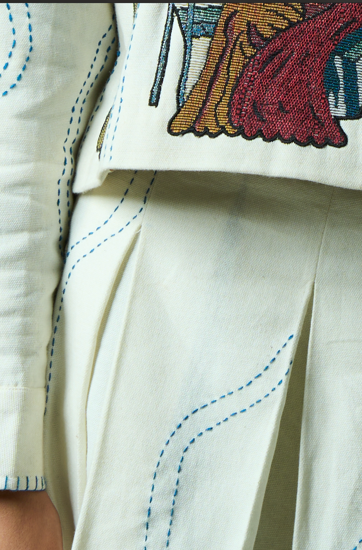 Jacquard fabric appliqué stitched onto panels